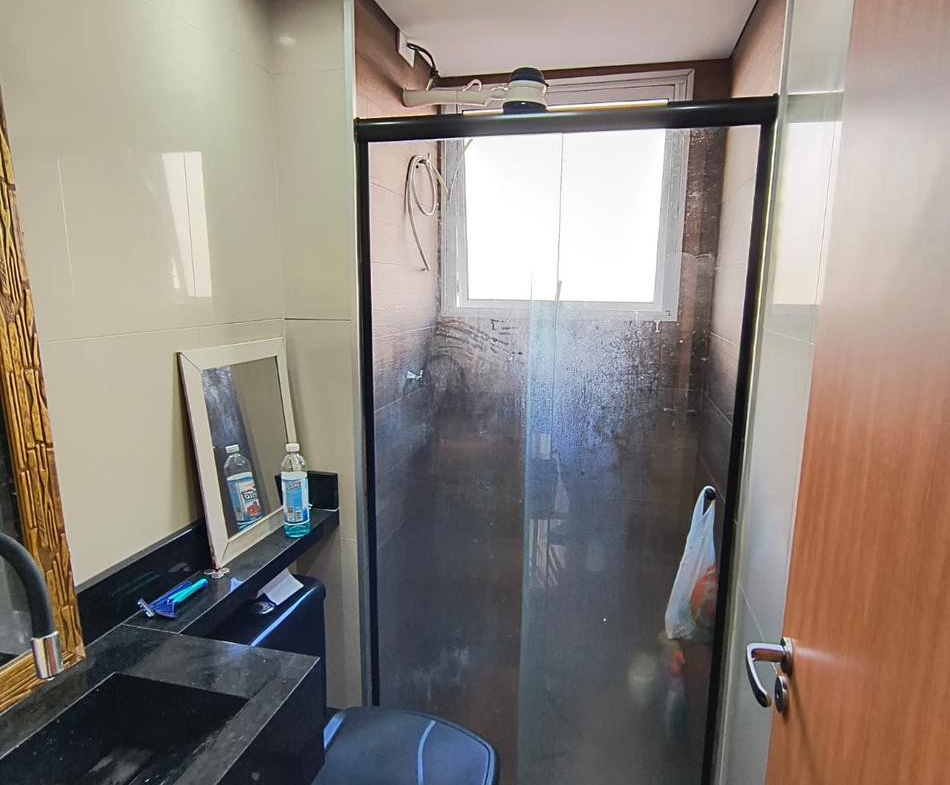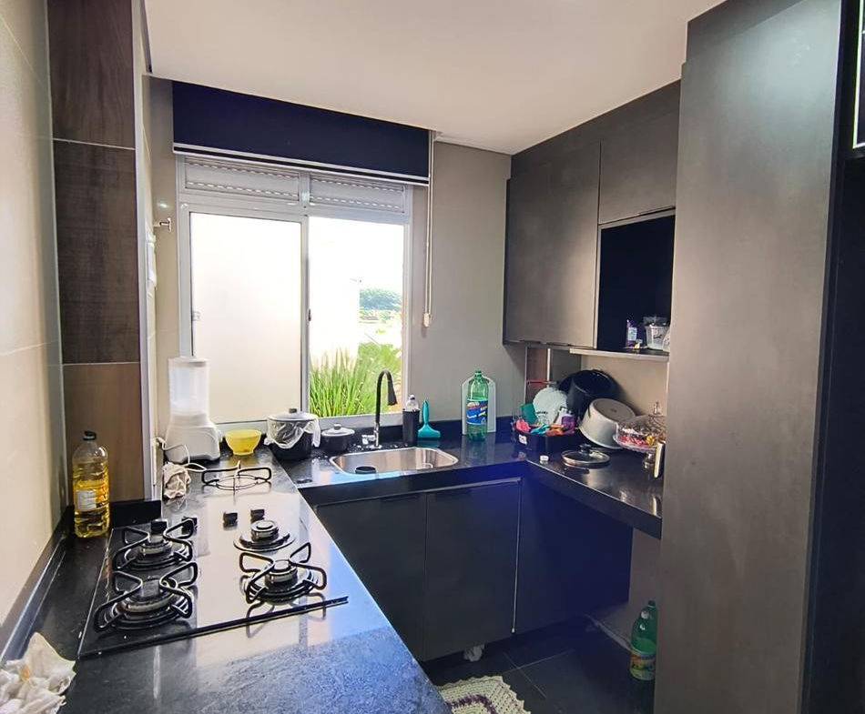 A cozinha conta com móveis planejados na cor preta e cooktop, 1 banheiro com cuba de granito, bacia preta e box em blindex.